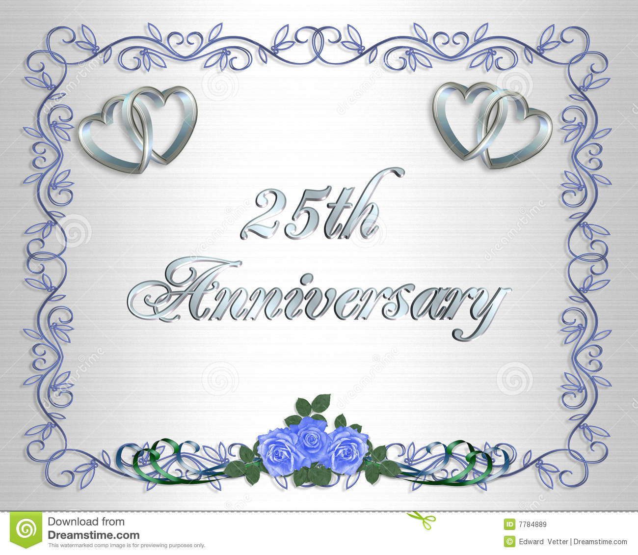Description: A 25th anniversary card with roses and hearts on a silver background with a blue rose and a silver frame.