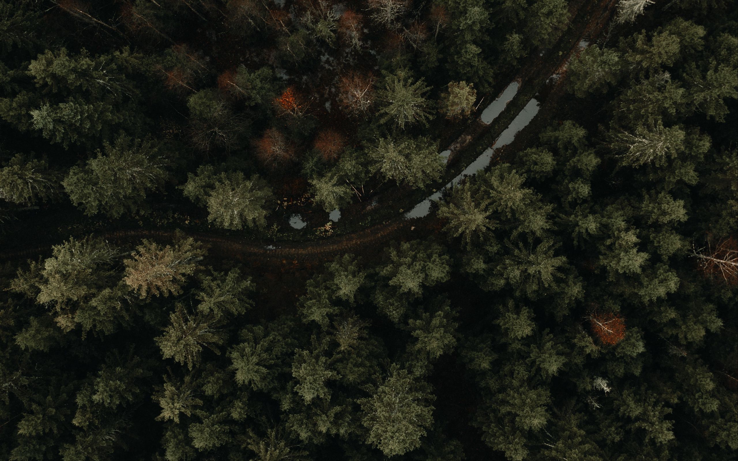 Description: A view of a forest from above with a snow covered road in the middle of the forest and trees.