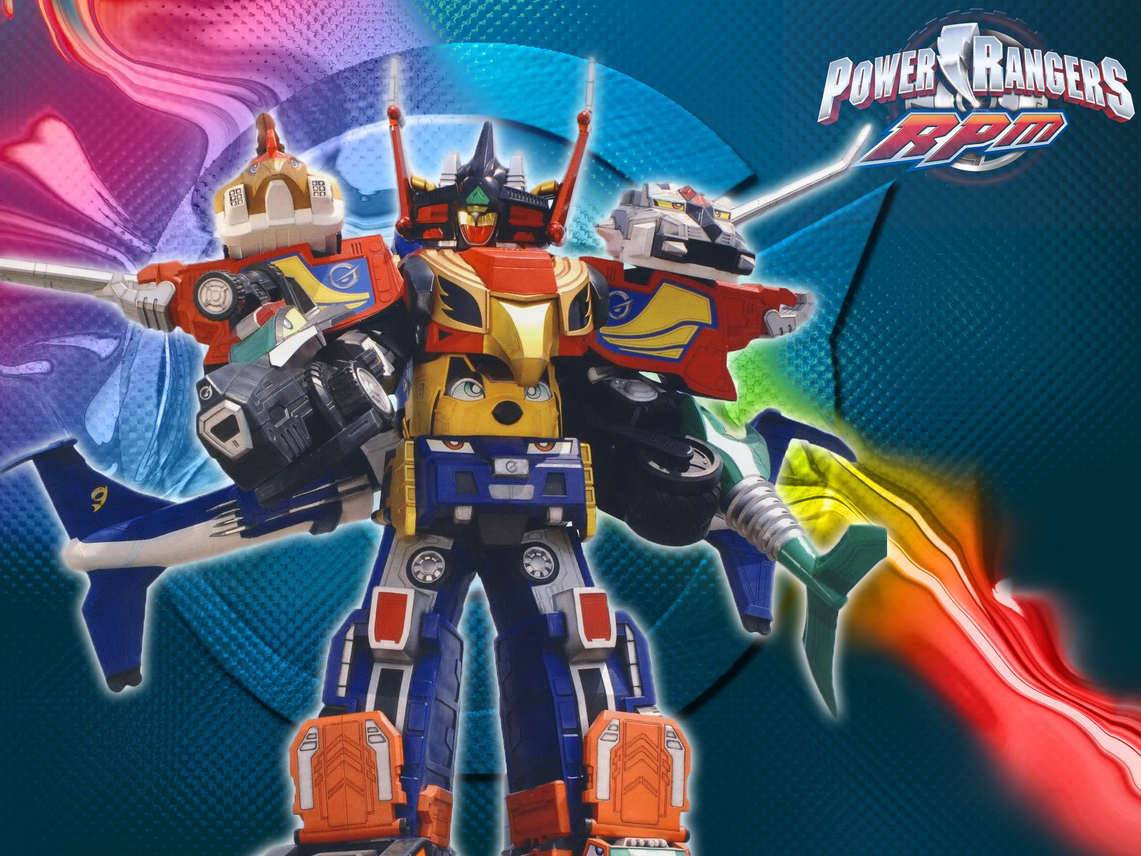 Description: A picture of a group of action figures in a graphic style with a blue background and a rainbow swirl.