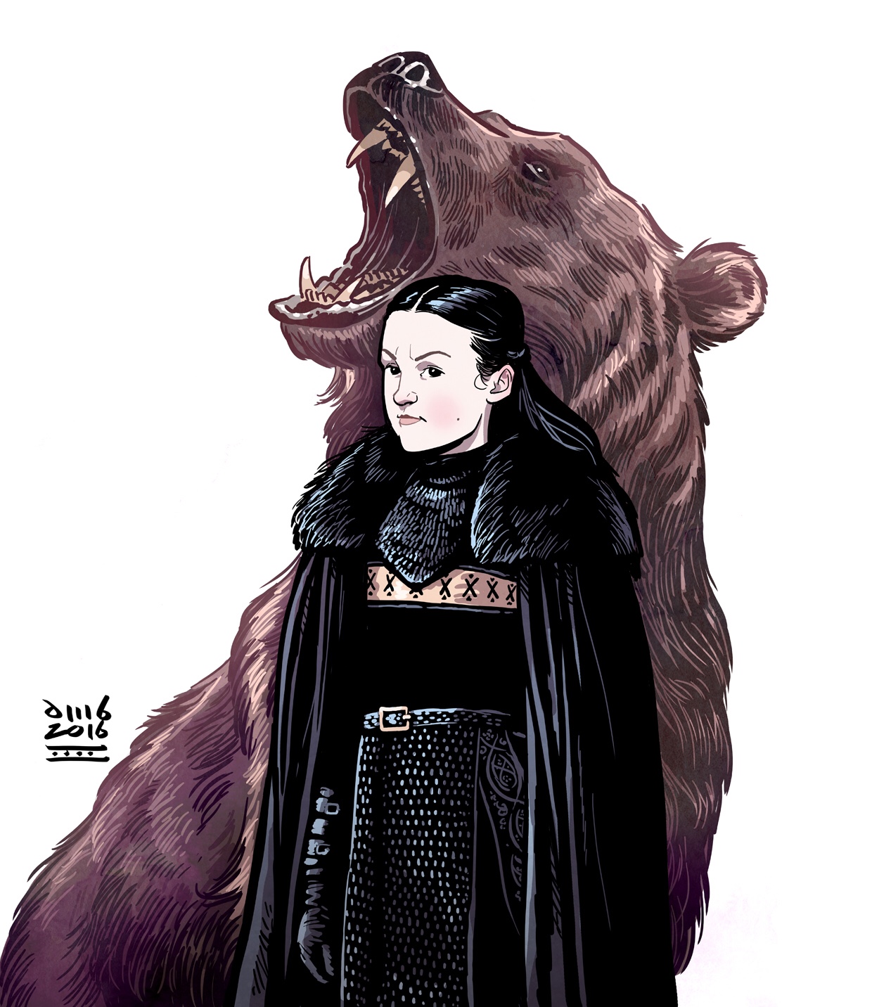Description: A drawing of a woman in a black cloak and a bear with a large mouth and a large black cape.