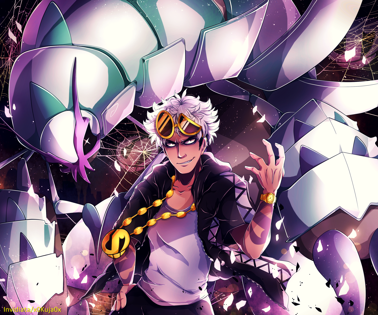 Description: A man in a white shirt and glasses standing in front of a purple and white object with a yellow chain.