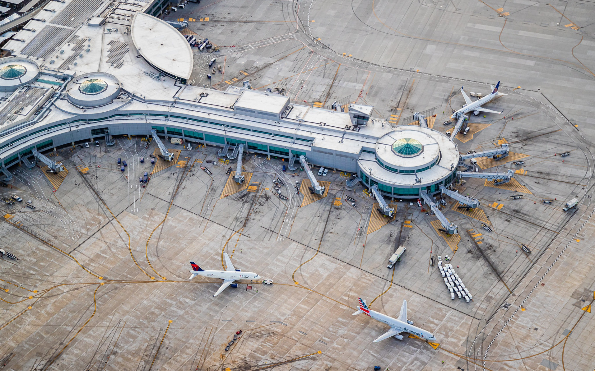 Description: An aerial view of an airport with airplanes parked at gates and a terminal building in the background.