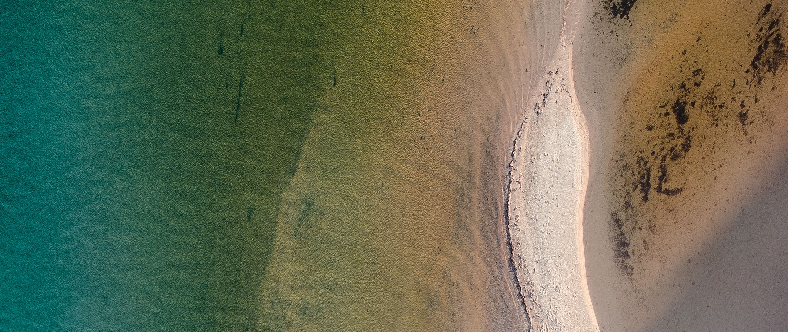 Description: A beach with a body of water and a sandy shore with a boat in the water and a bird's eye view of the beach.
