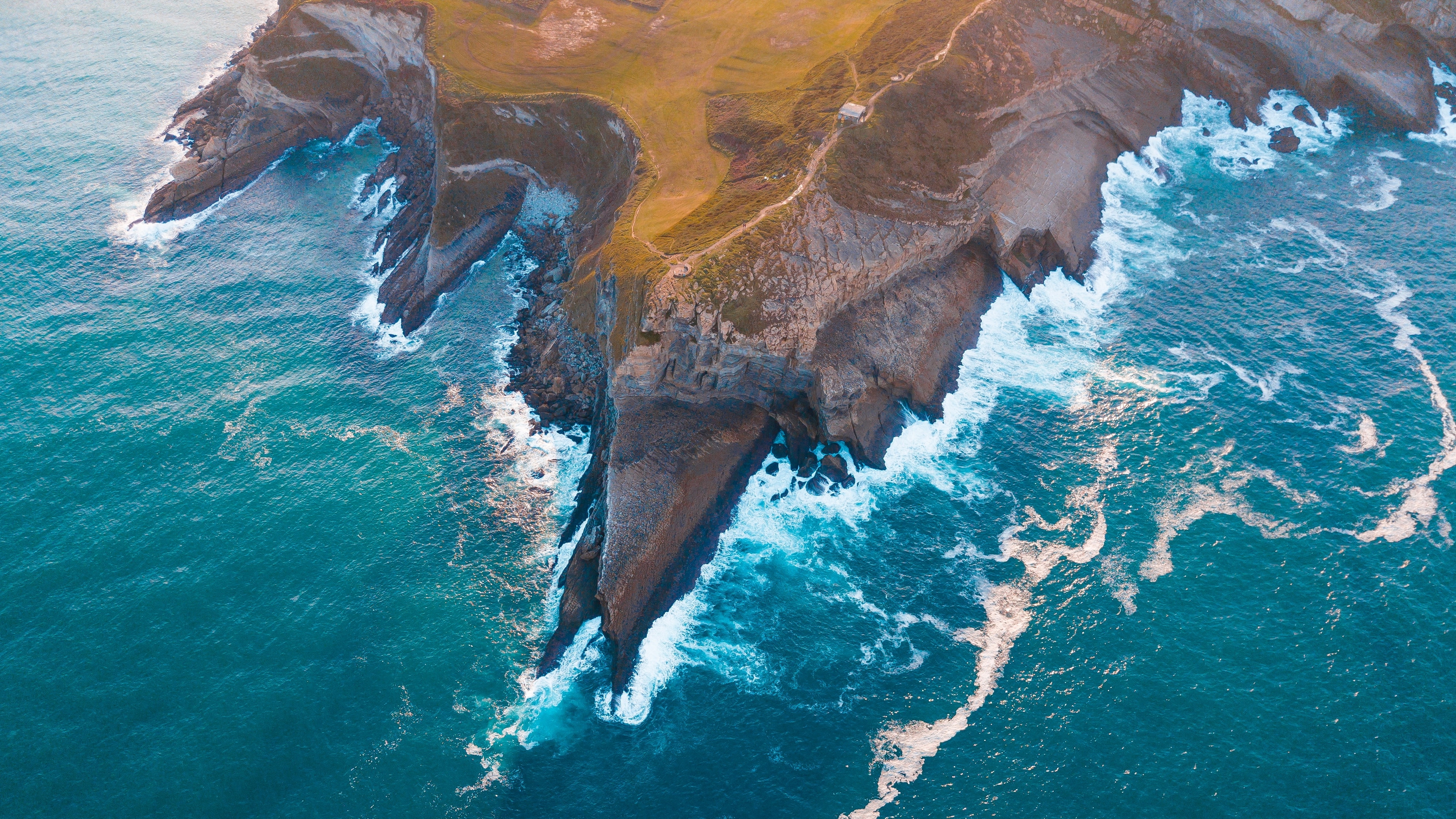 Description: An aerial view of a large island in the ocean with a plane flying over it and a plane flying over it.