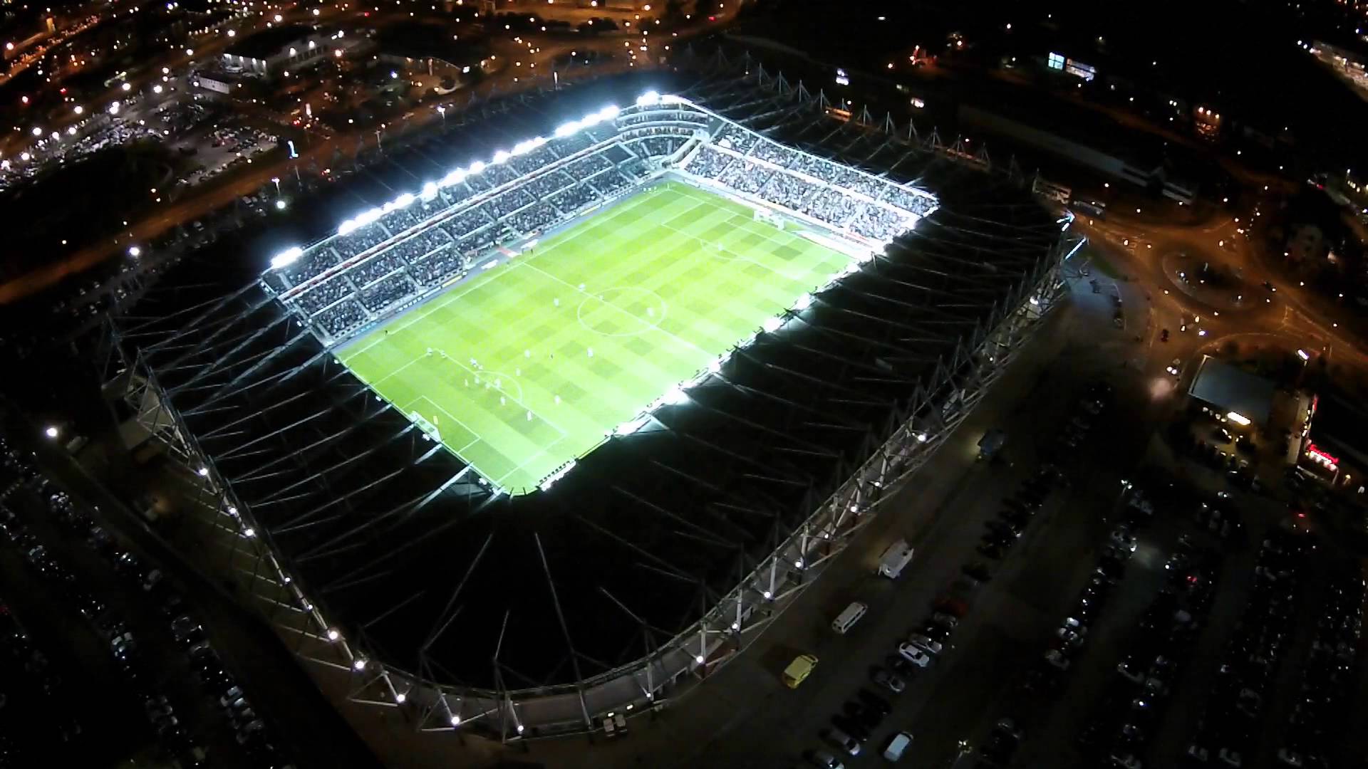 Description: An aerial view of a stadium at night with a green field and lights on it and a stadium in the background.