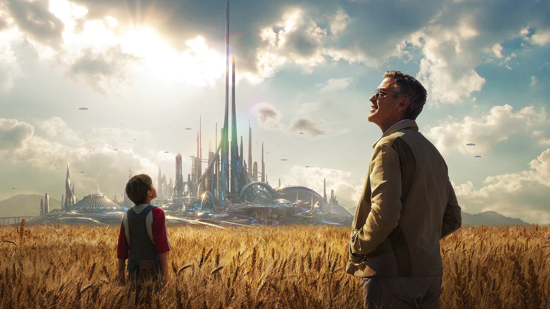 Description: A man and a boy standing in a field looking at a castle in the distance with a sky background.