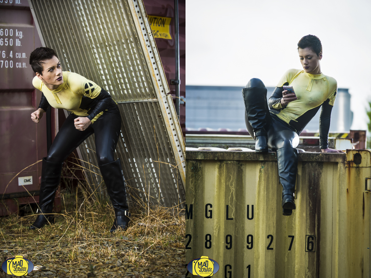 Description: A man in a yellow shirt and black pants leaning against a metal container and looking at his cell phone.