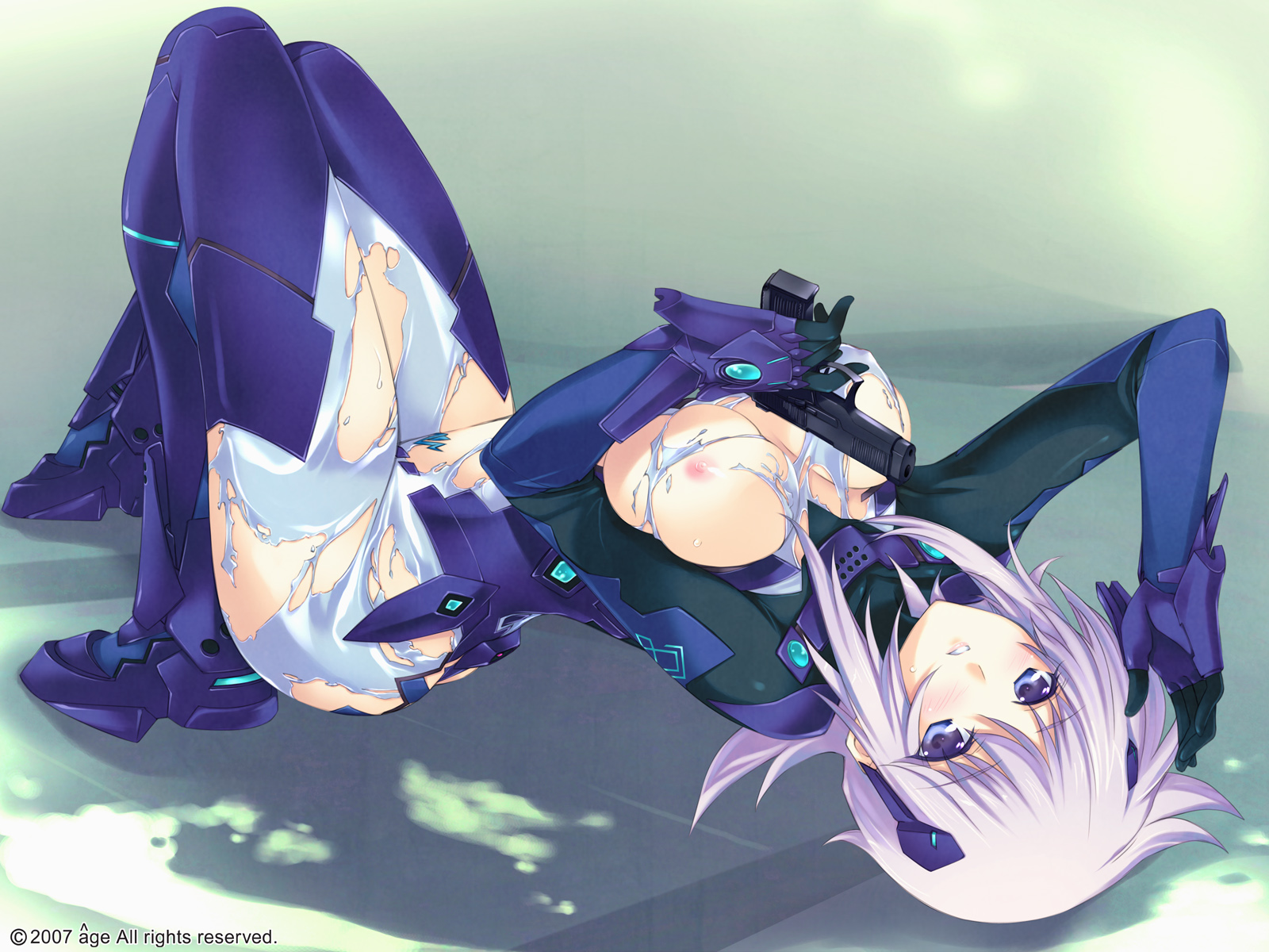 Description: A cartoon character laying on the ground with a sword in her hand and a purple outfit on her chest.
