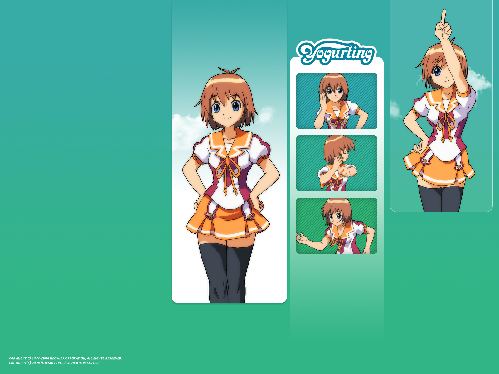 Description: A girl in a uniform with a hand up in front of her face and a green background with a picture of her.