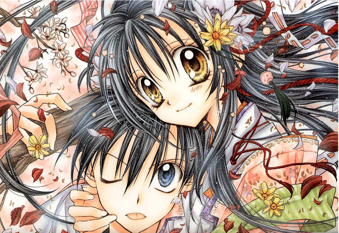 Description: A couple of anime characters with flowers in their hair and eyes.