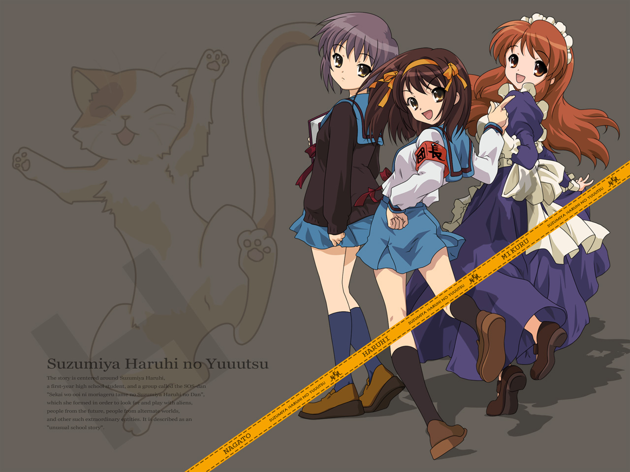 Description: Three anime characters standing next to each other with a measuring tape in front of them and a cat behind them.
