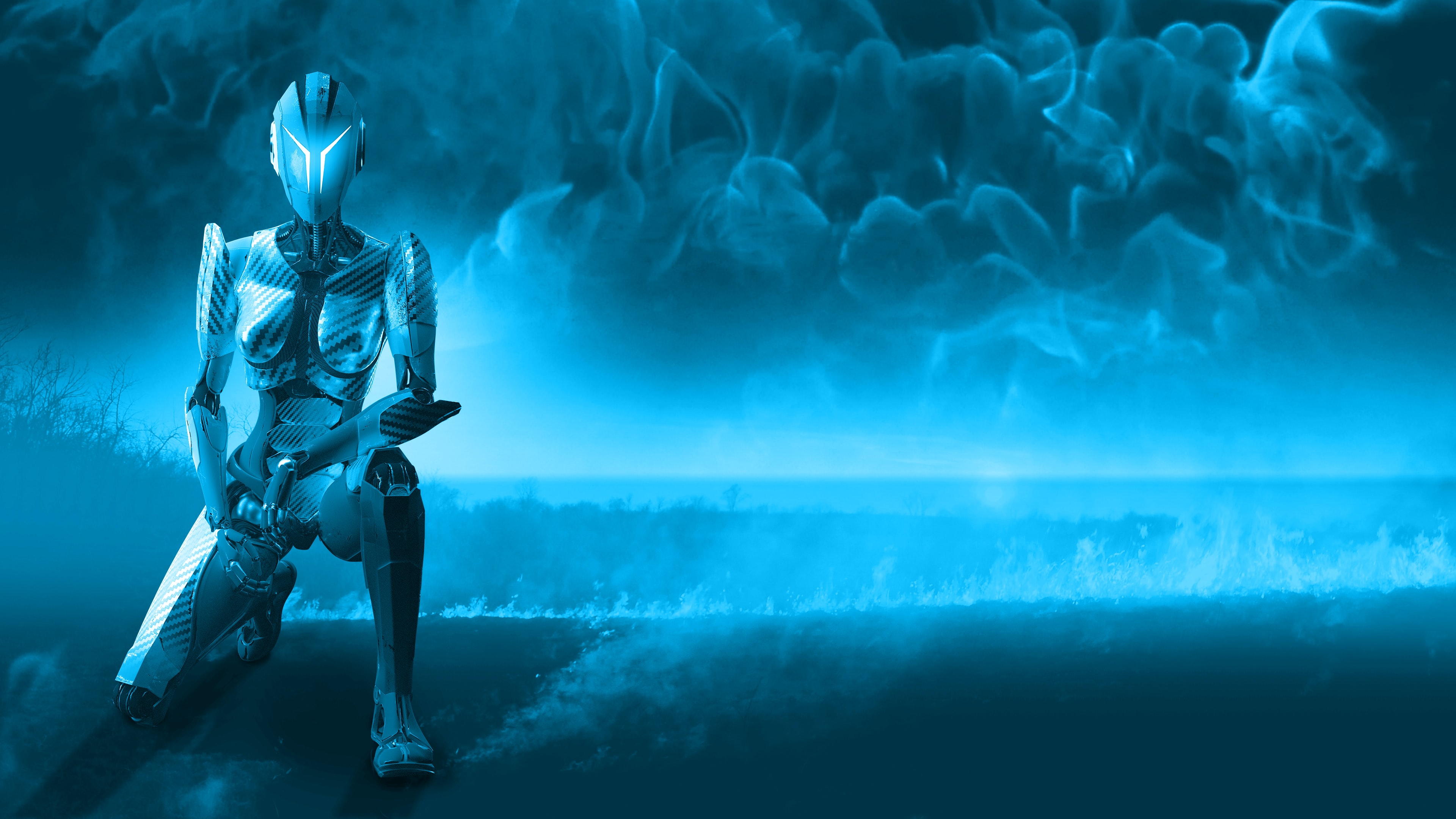 Description: A robot standing in front of a blue background with clouds of smoke and water behind it.