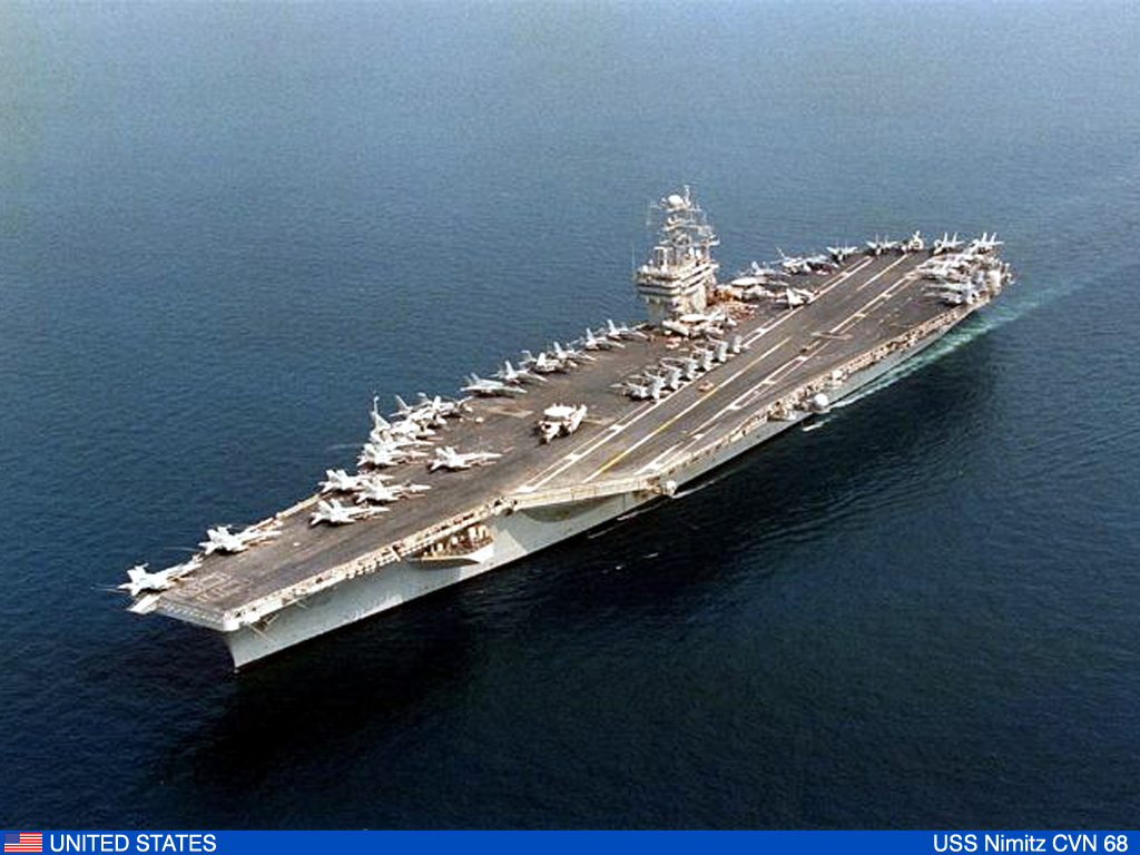 Description: A large aircraft carrier floating in the ocean with a sky background and a blue border around it that says united states.