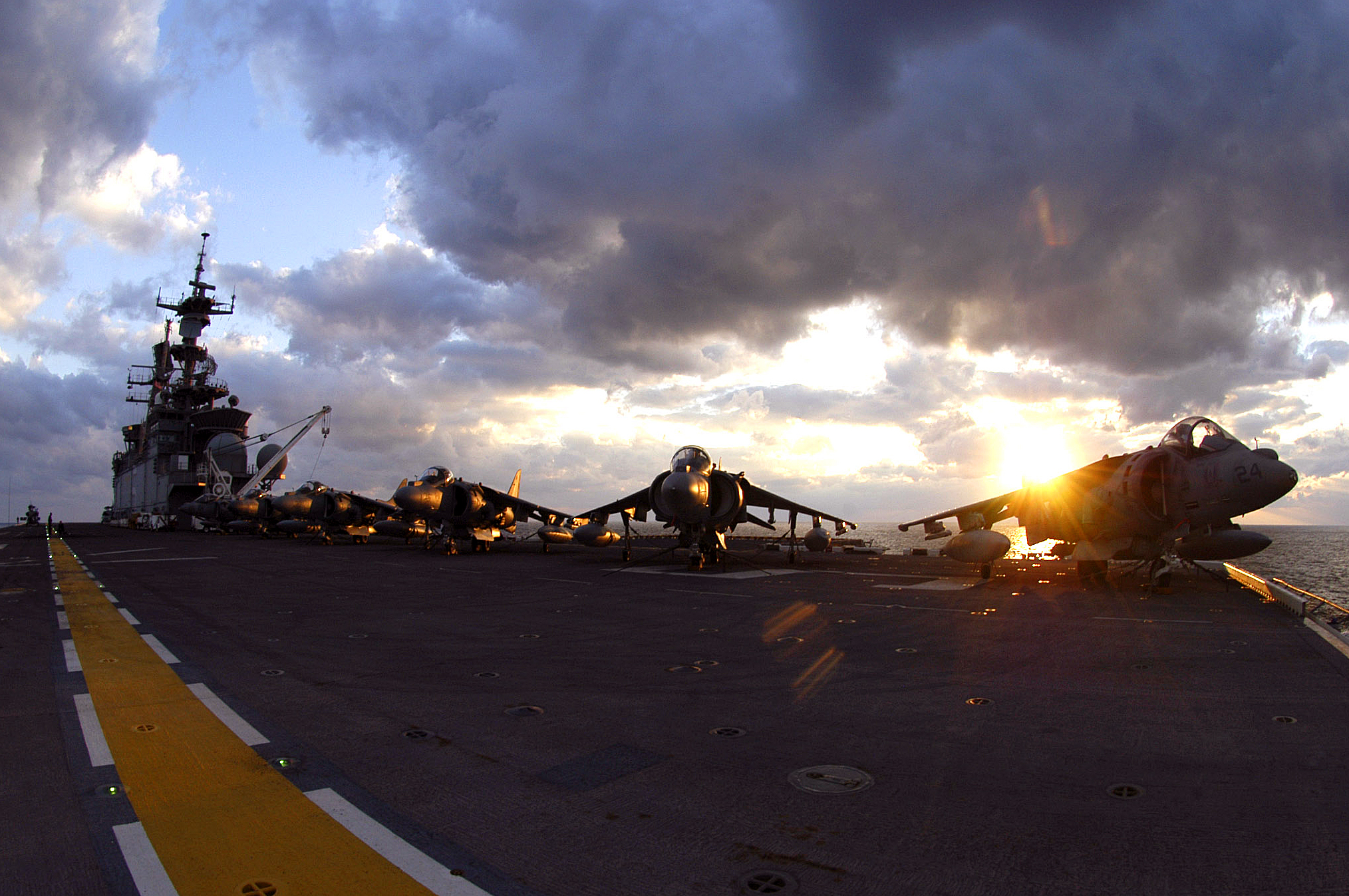 Description: A large aircraft carrier sitting on top of an aircraft carrier carrier on a runway near the ocean at sunset.