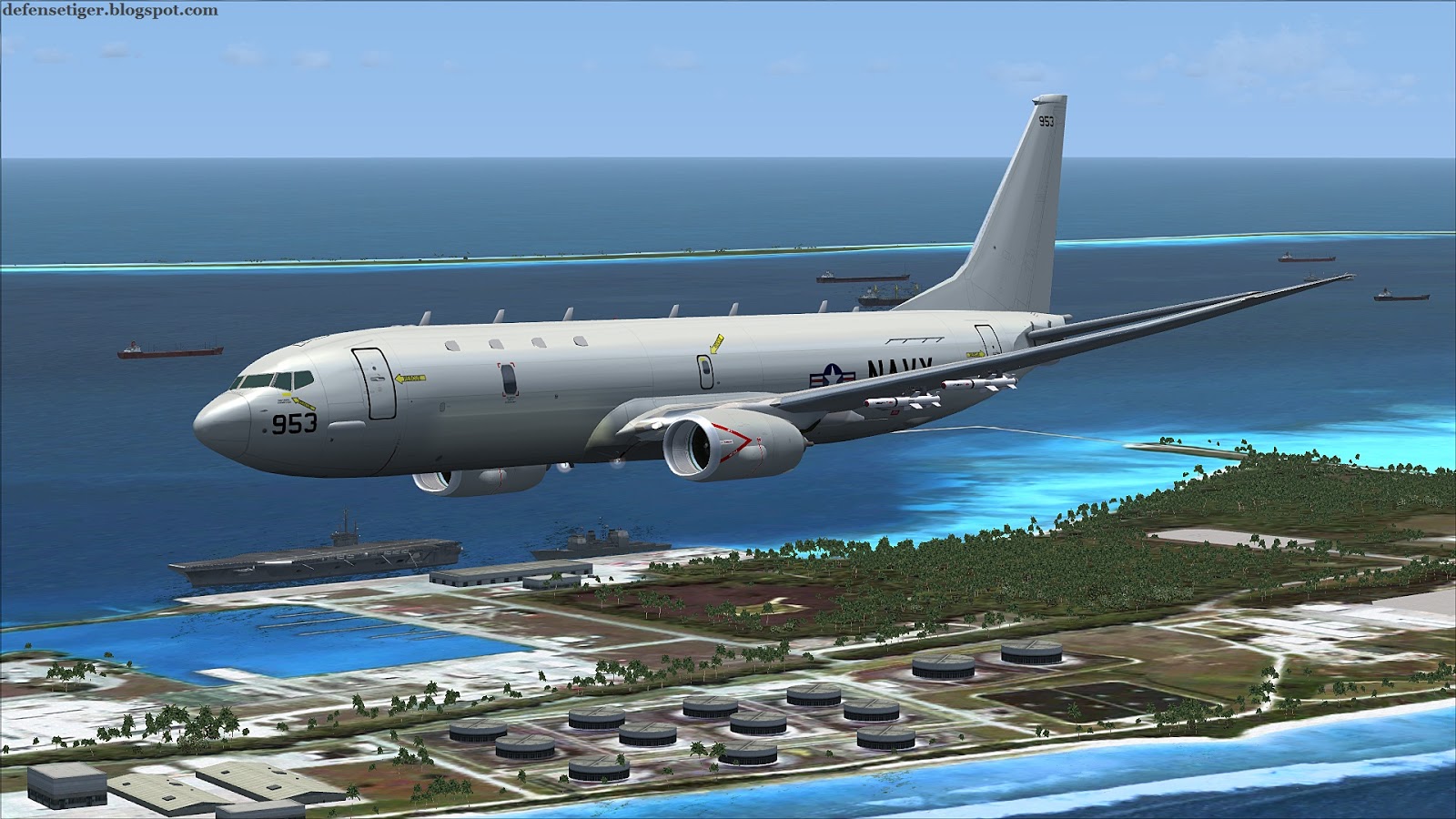 Description: A large airplane flying over a small island in the ocean with a boat in the background and a smaller island in the foreground.