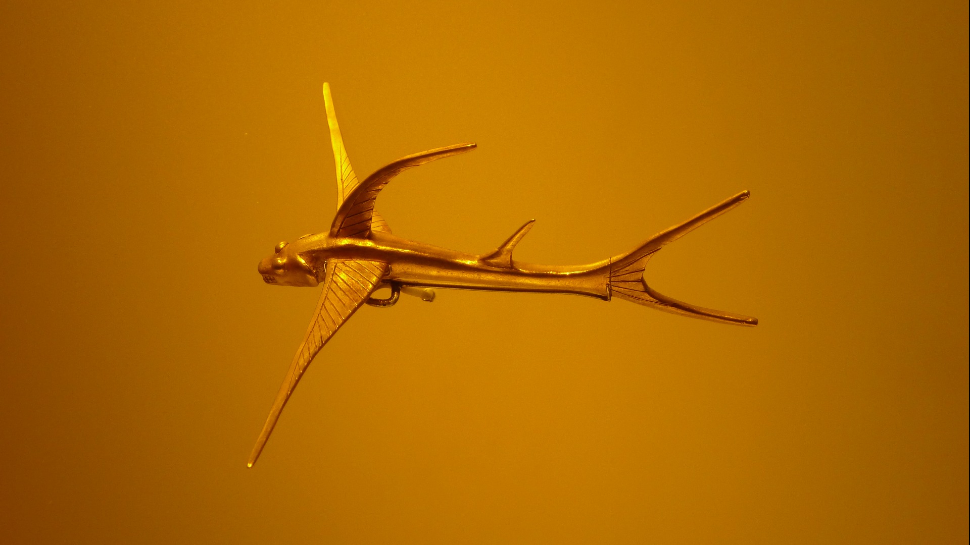 Description: A large airplane flying through a yellow sky with a tail fin in the air.