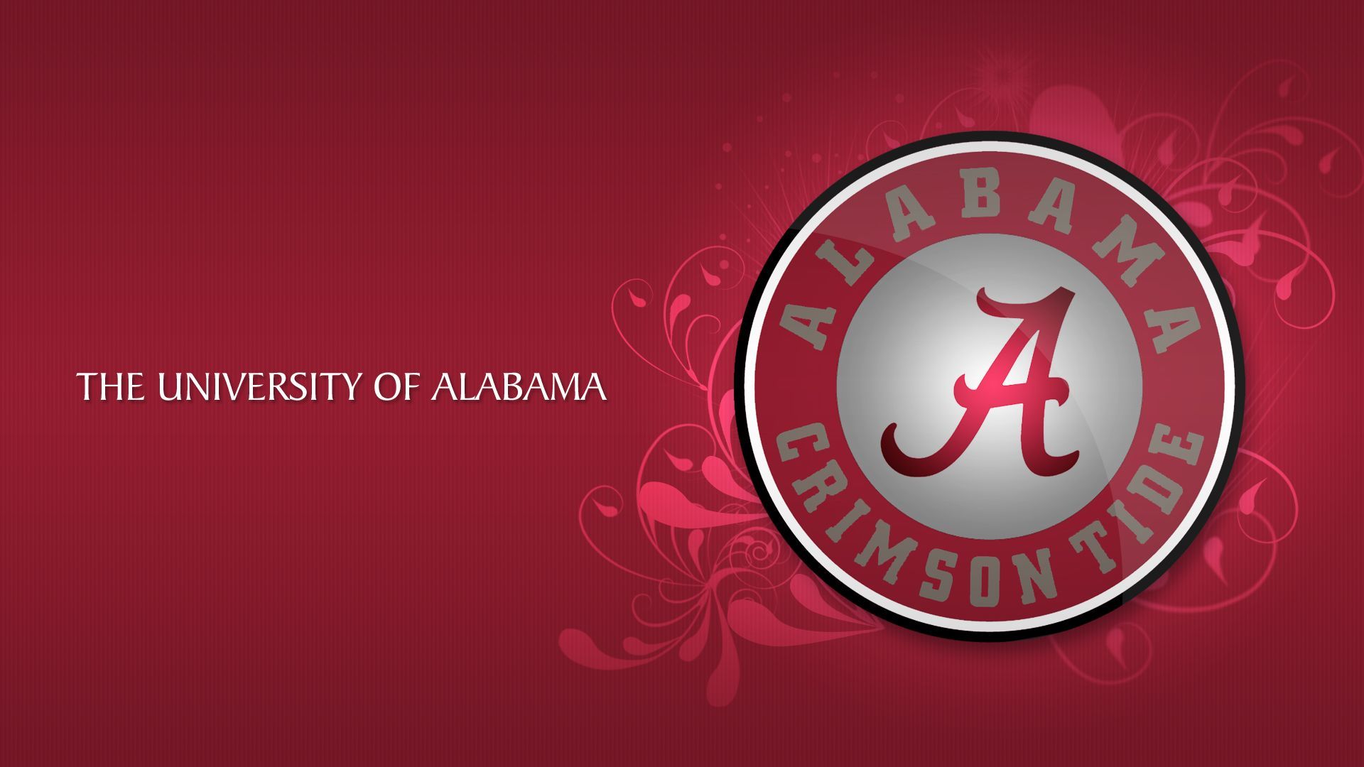 Description: The university of alabama logo on a red background with a floral design and a white circle with the letter a.