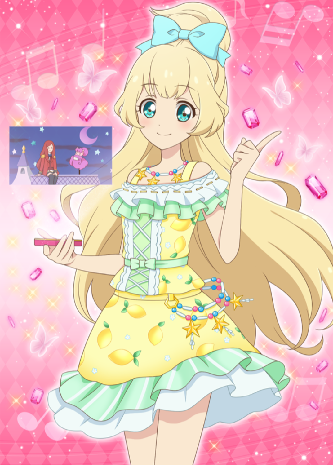 Description: A girl in a dress with a bow on her head and a pink background with music notes and stars.