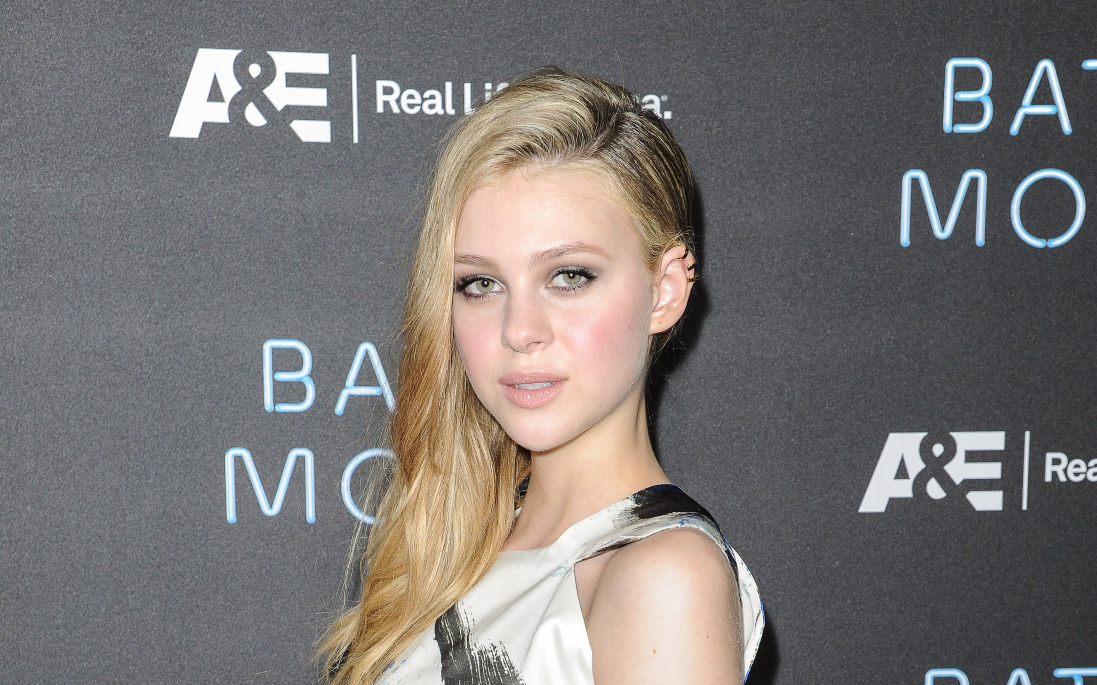 Description: A woman with long blonde hair and a white dress at a event with a bat moca logo on the wall.