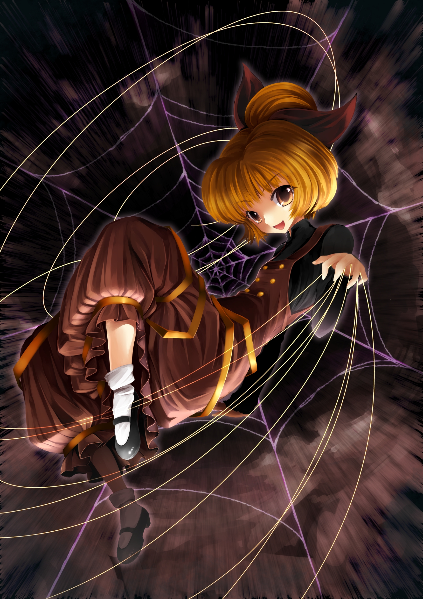 Description: A woman in a brown dress is laying on a spider web with her legs spread out and her head tilted.