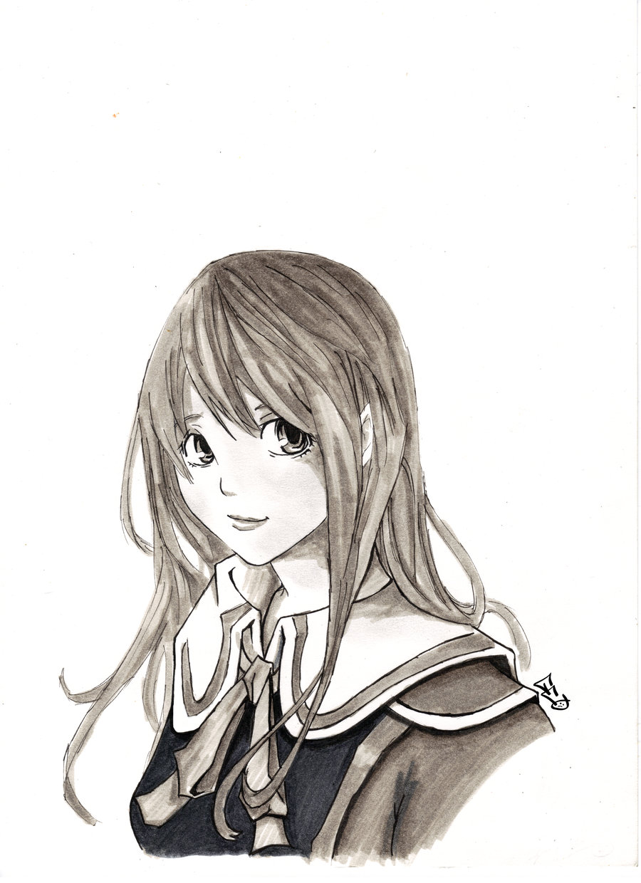 Description: A drawing of a girl with long hair and a black shirt on her shoulders and a white background with a black and white background.