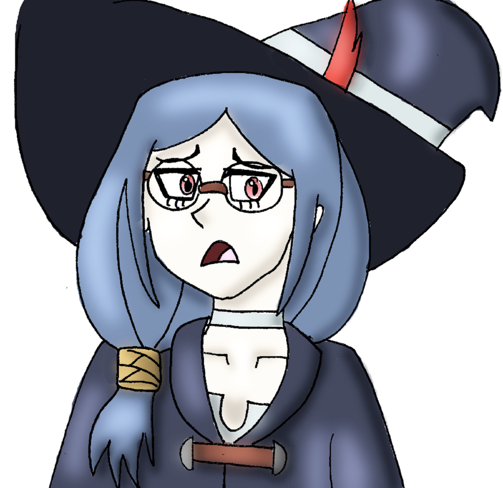 Description: A cartoon character with a hat and glasses on her head and a blue wig and a black dress and a black hat.