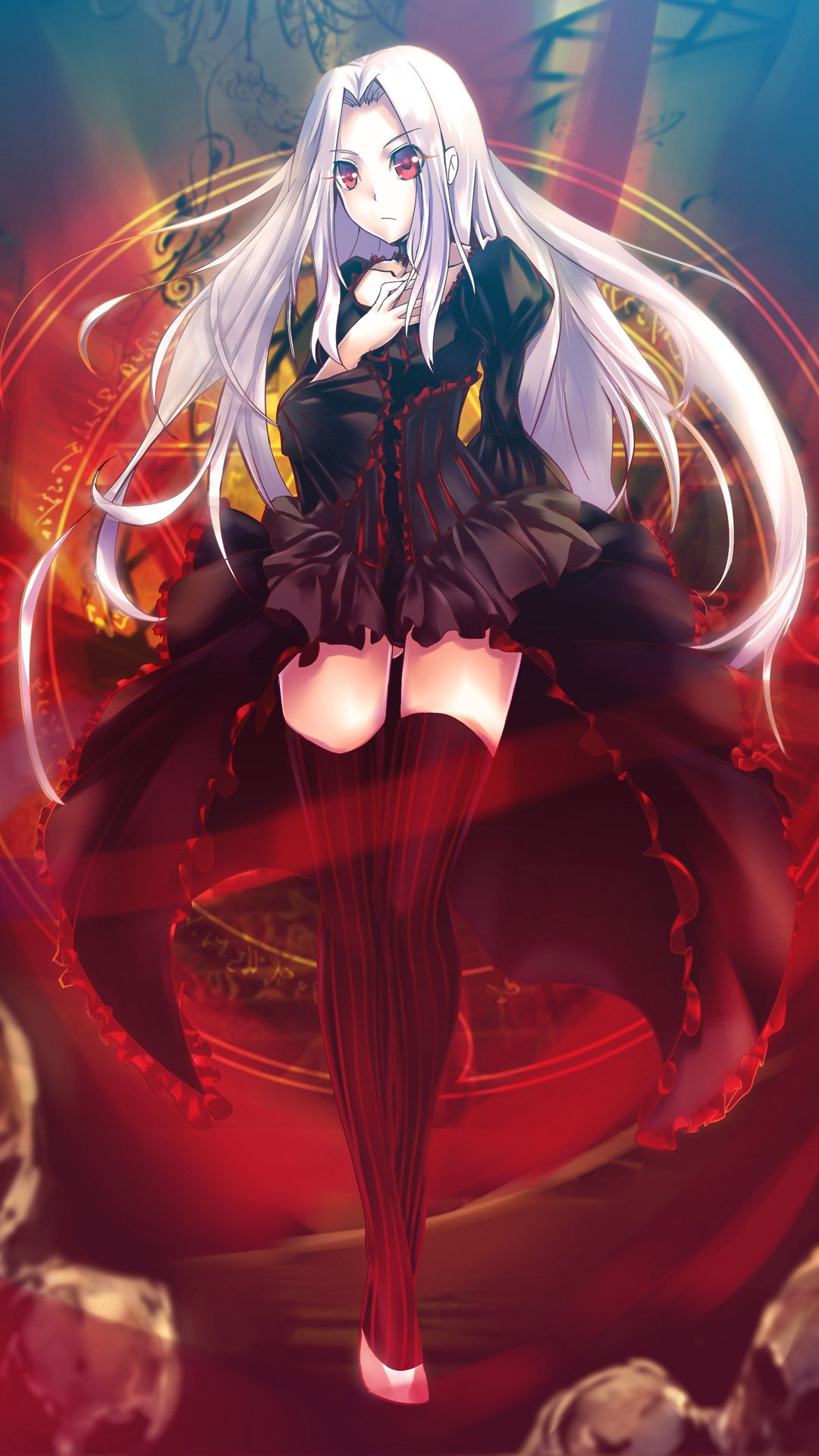 Description: A woman in a black dress with white hair and a red skirt is sitting on a red and blue background.