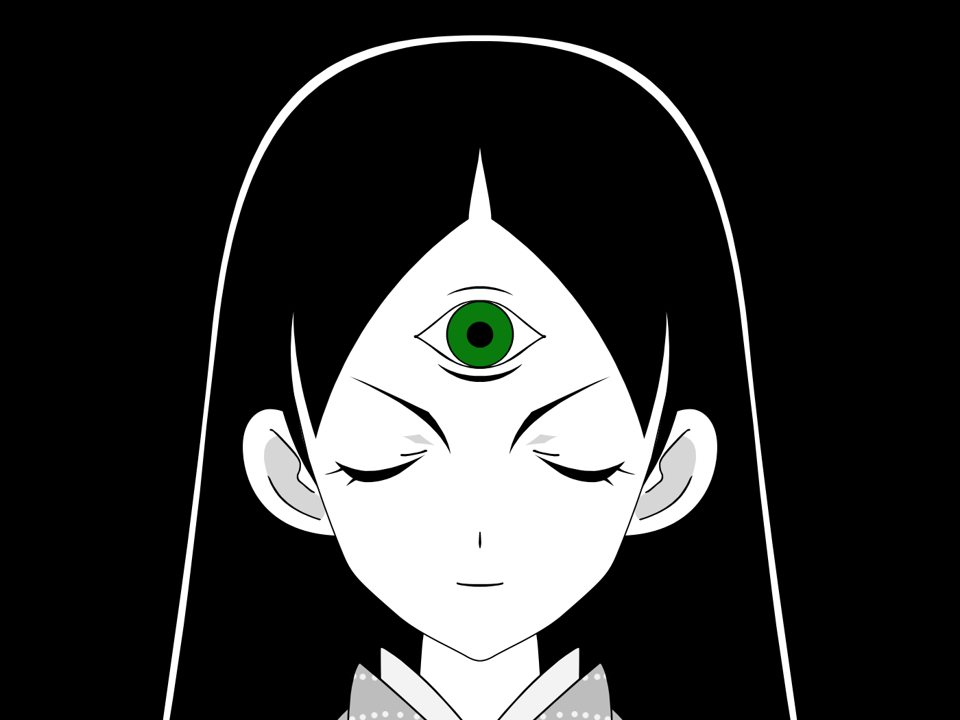 Description: A woman with green eyes and a black background with a white outline of her face and a green eye.