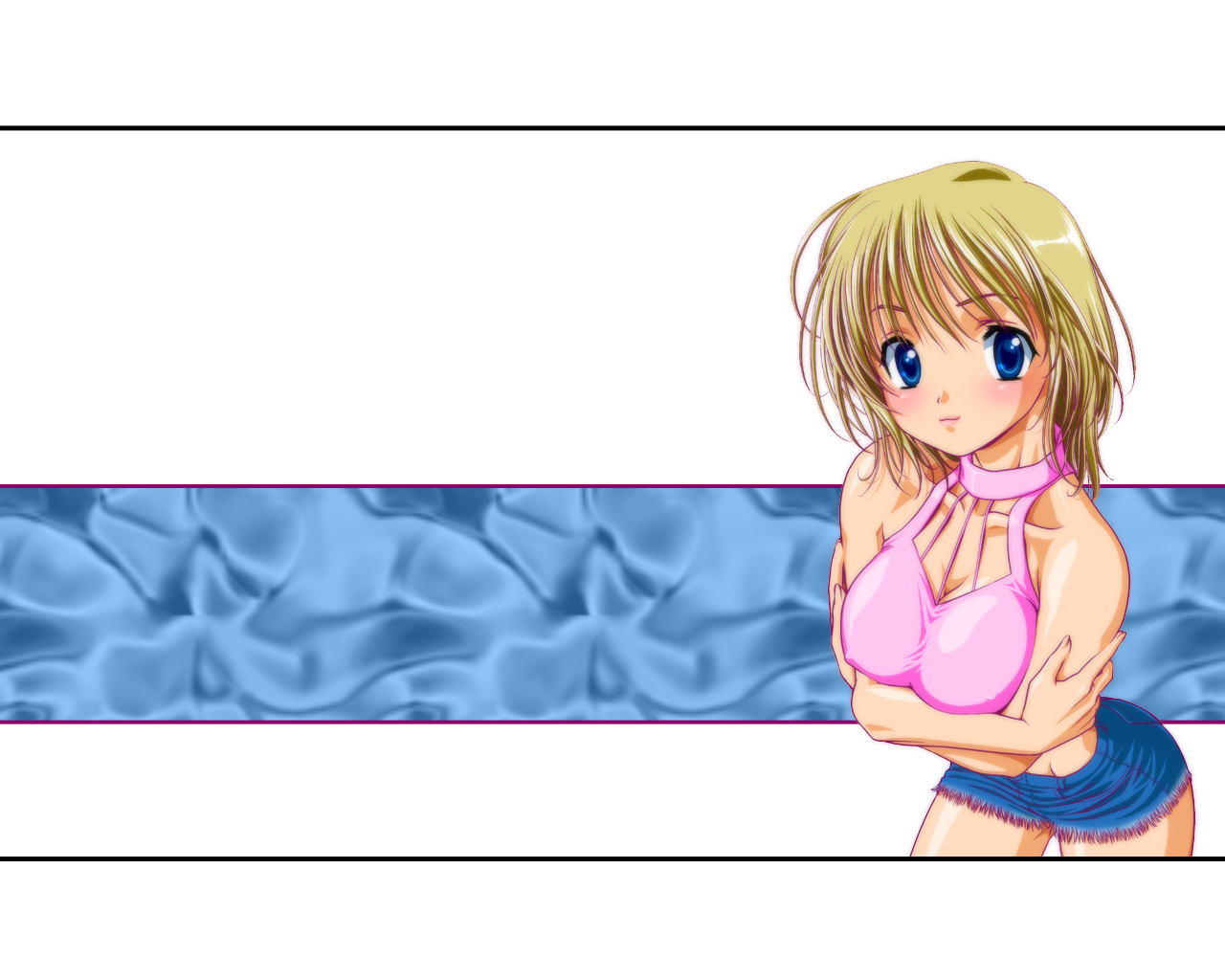 Description: A girl in a pink top and blue skirt posing for a picture with her arms crossed and her chest crossed.