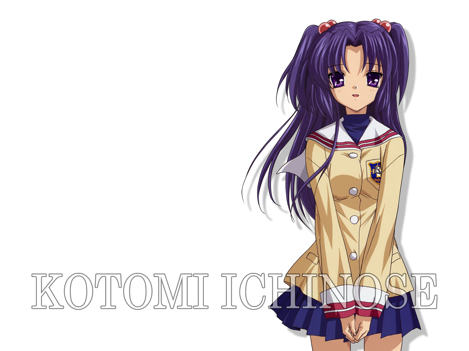 Description: A girl in a uniform with long purple hair and a bow in her hair.