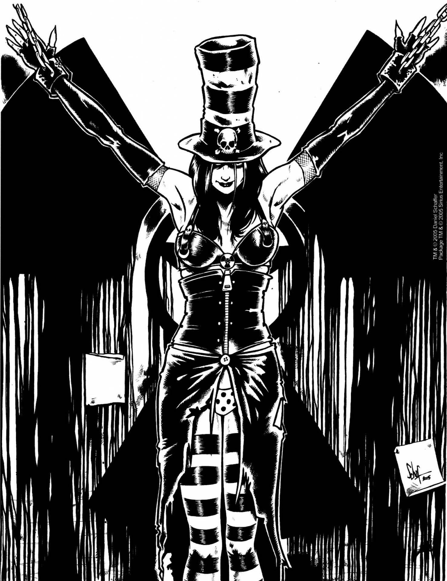 Description: A black and white drawing of a woman in a top hat and costume with her arms outstretched in the air.