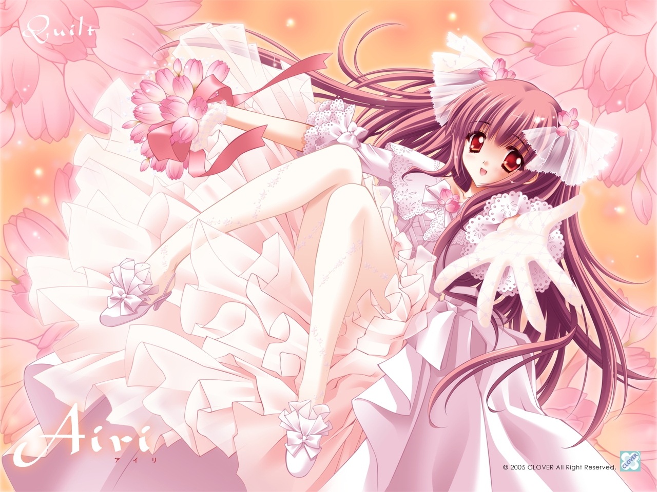 Description: A girl in a white dress laying on a flowery bed of flowers with her hair blowing in the wind.