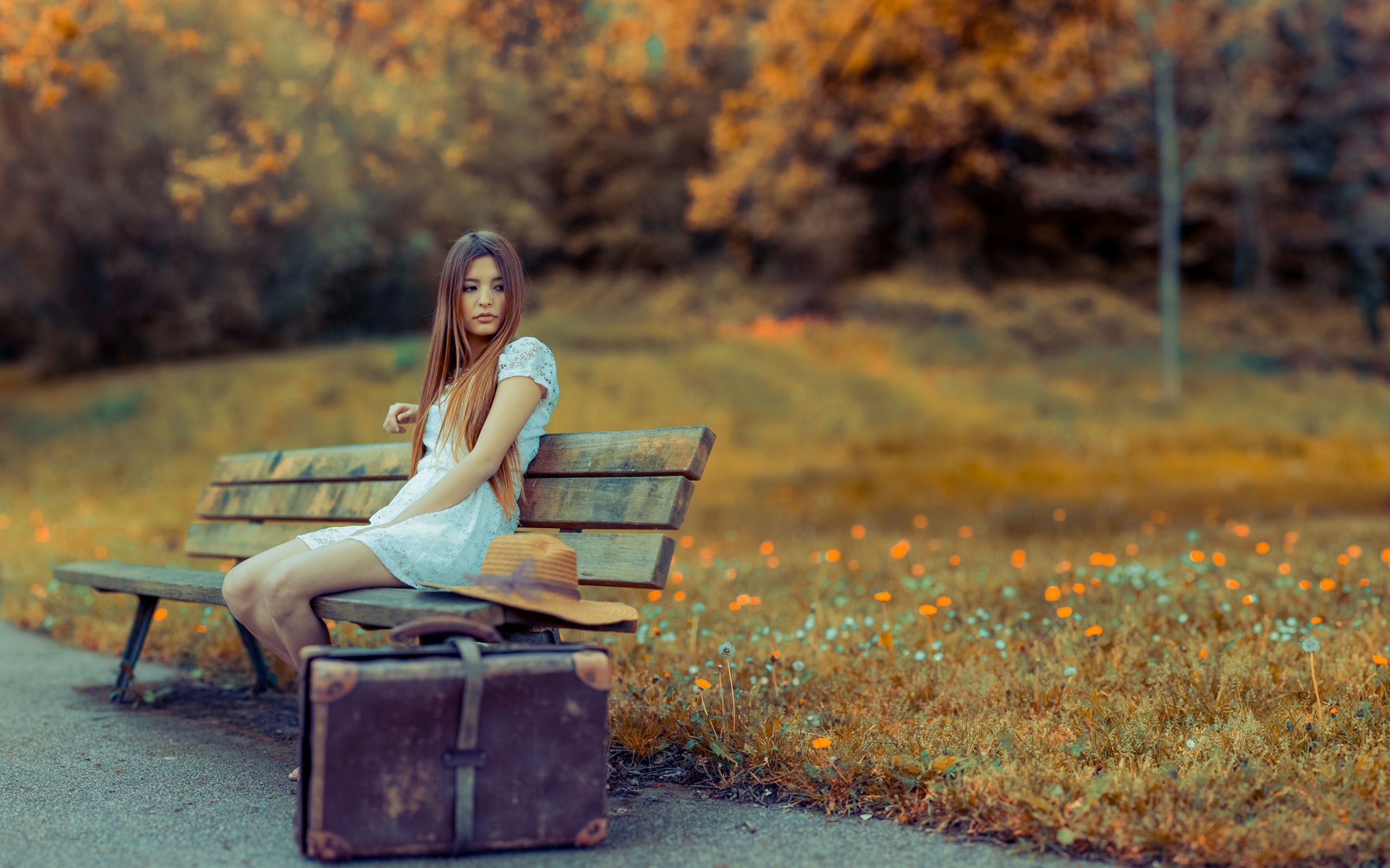 Description: A woman sitting on a bench with a suitcase in front of her and a suitcase behind her on the ground.