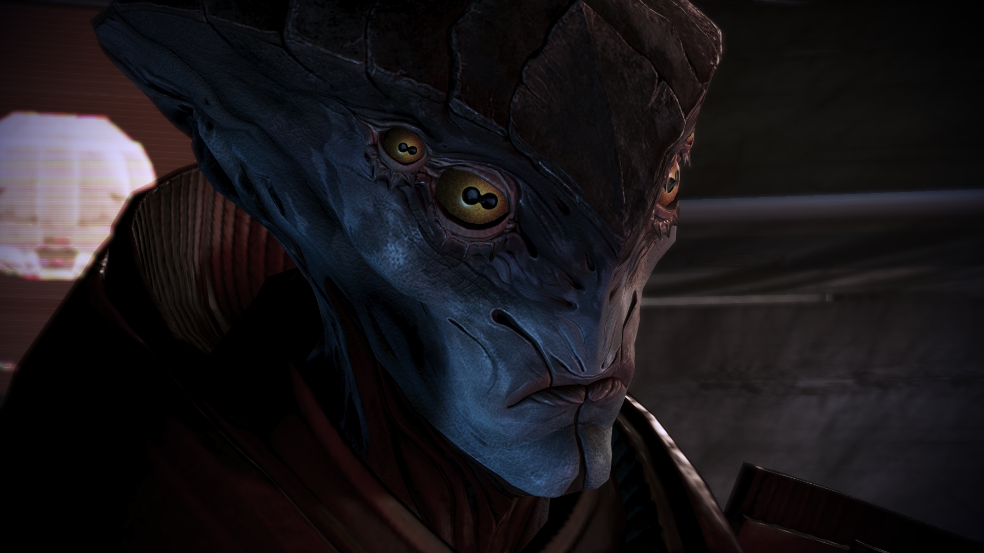 Description: A close up of a person wearing a alien costume with a tie and a lantern in the background with a light on.