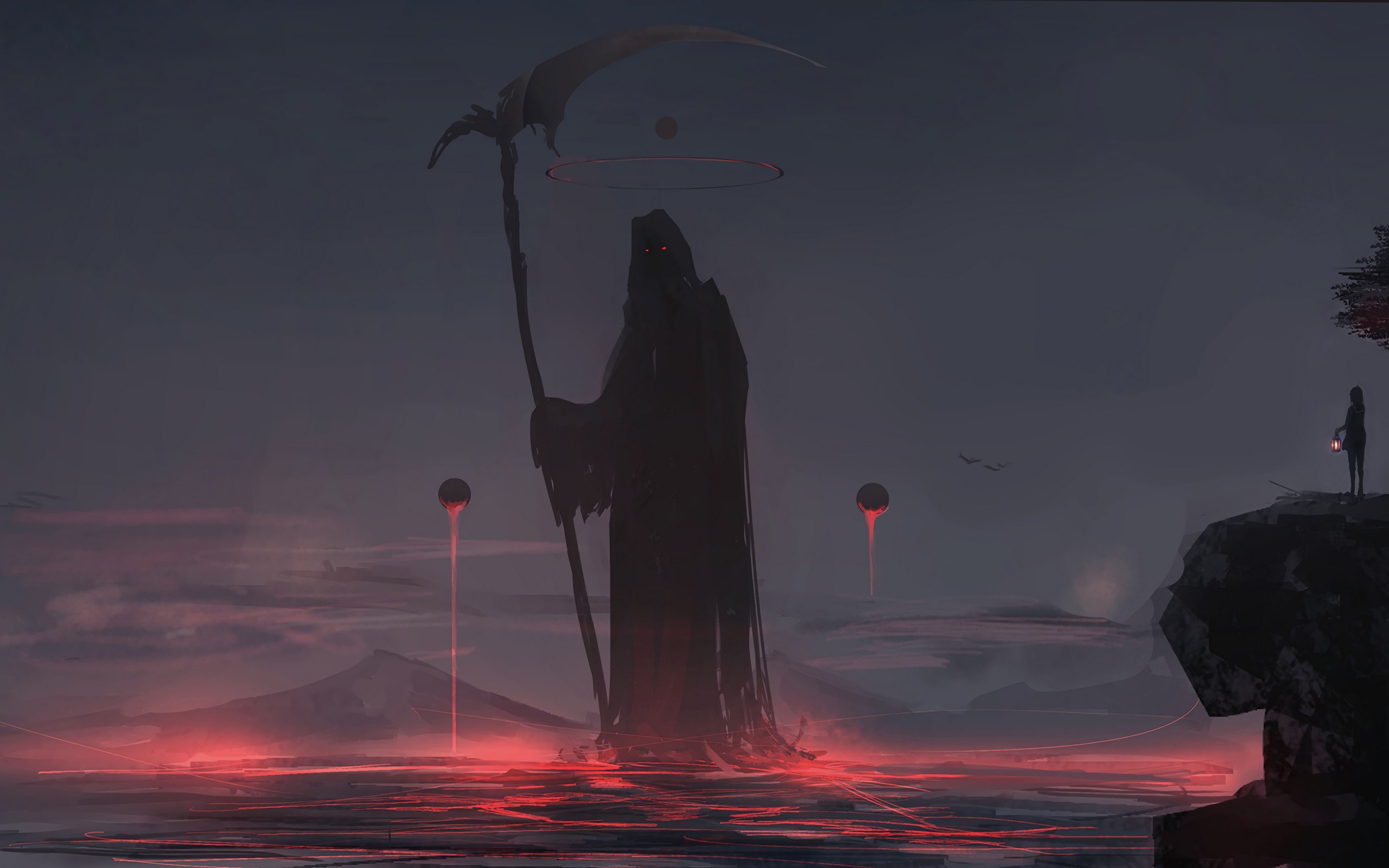 Description: A painting of a man standing in the middle of a body of water with a giant alien like creature.
