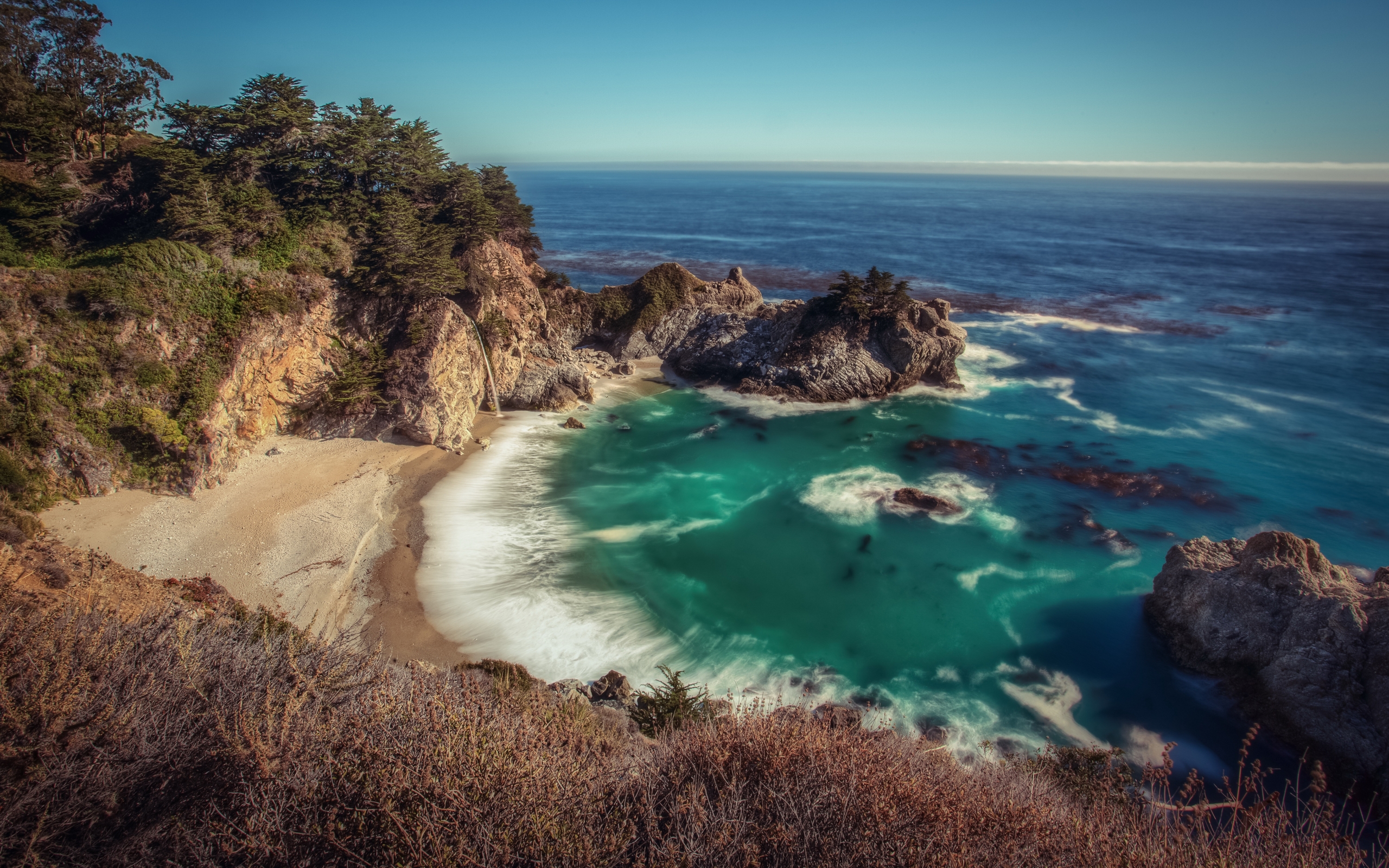 Description: A beach with a body of water and a cliff with trees on it and a blue sky above it.