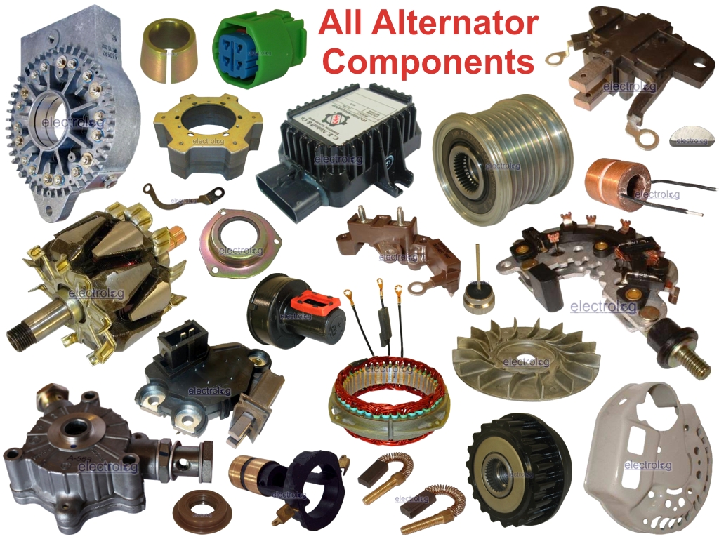 Description: A collection of all different alter motor components and parts for a car or truck engine and parts for a motorcycle.