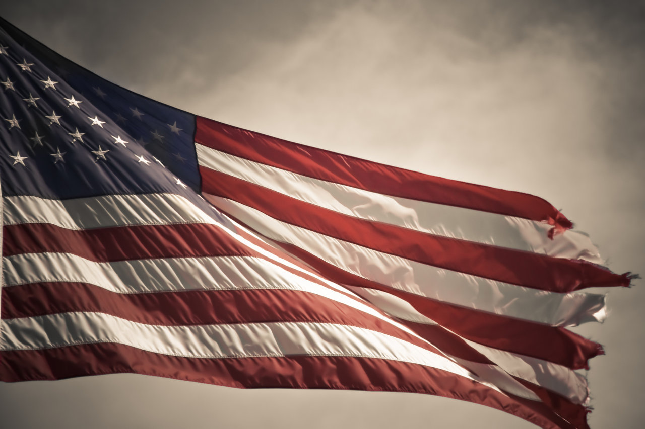 Description: A large american flag flying in the wind with a cloudy sky behind it and a sunbeam in the background.