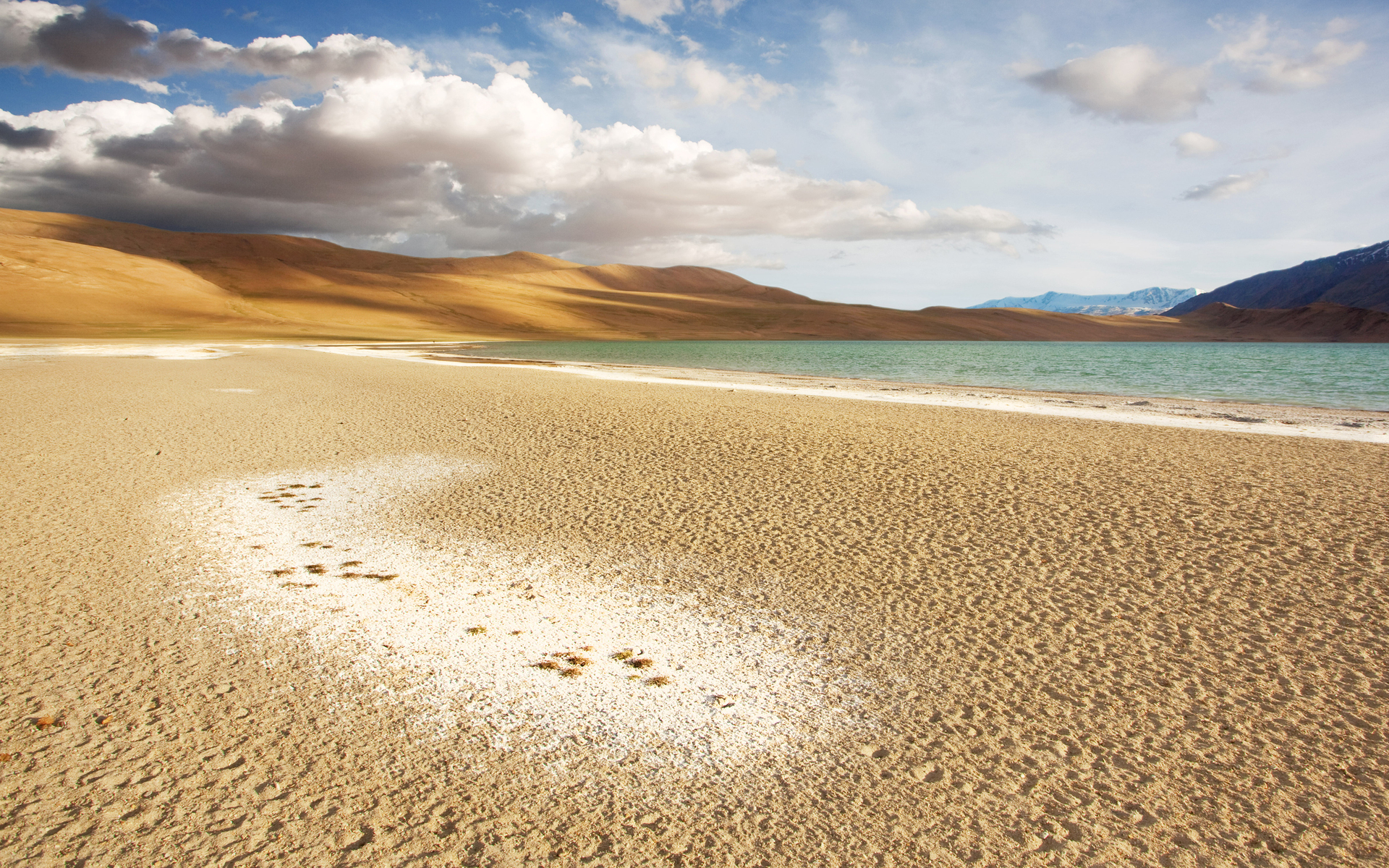 Description: A sandy beach with a body of water and mountains in the background with clouds in the sky above it.