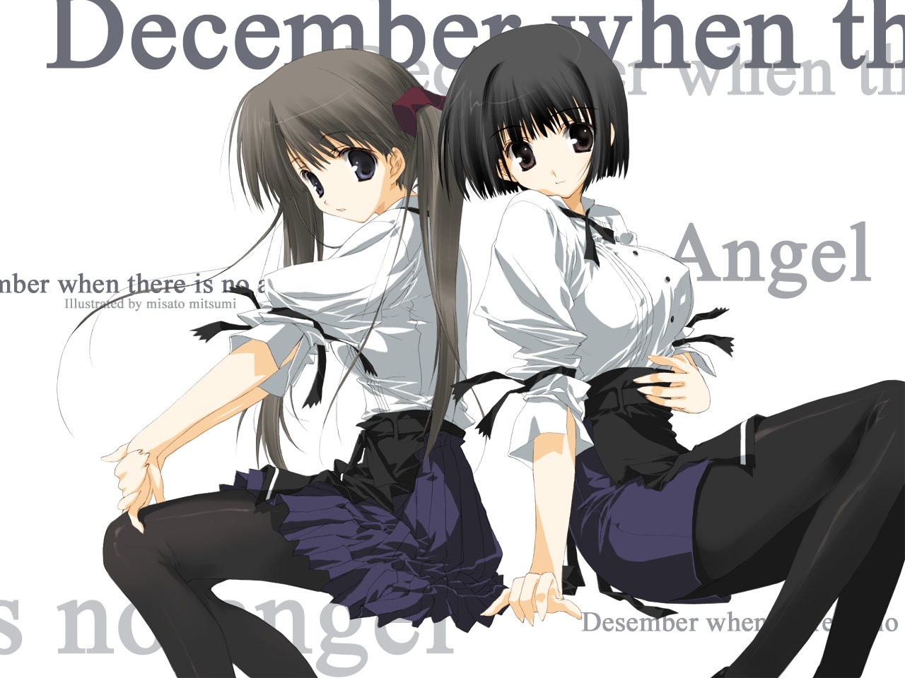 Description: Two anime girls sitting next to each other with words in the background that say december when the girl is angel.