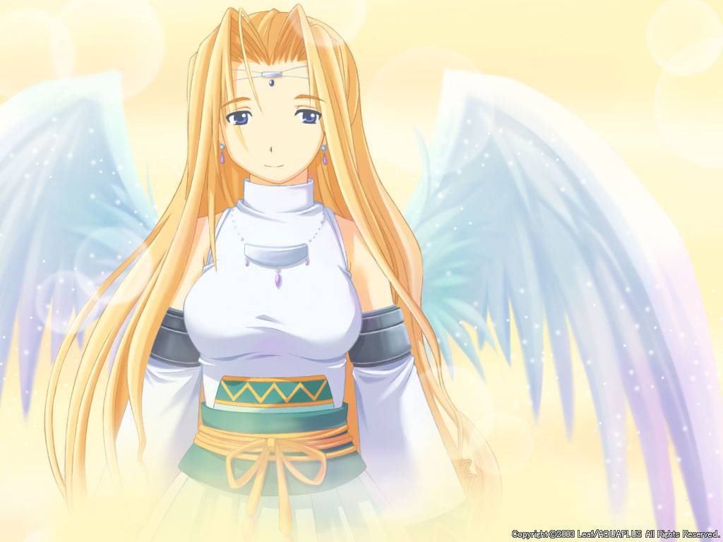 Description: A girl with blonde hair and a white shirt with angel wings on her chest and a white shirt with a green belt.