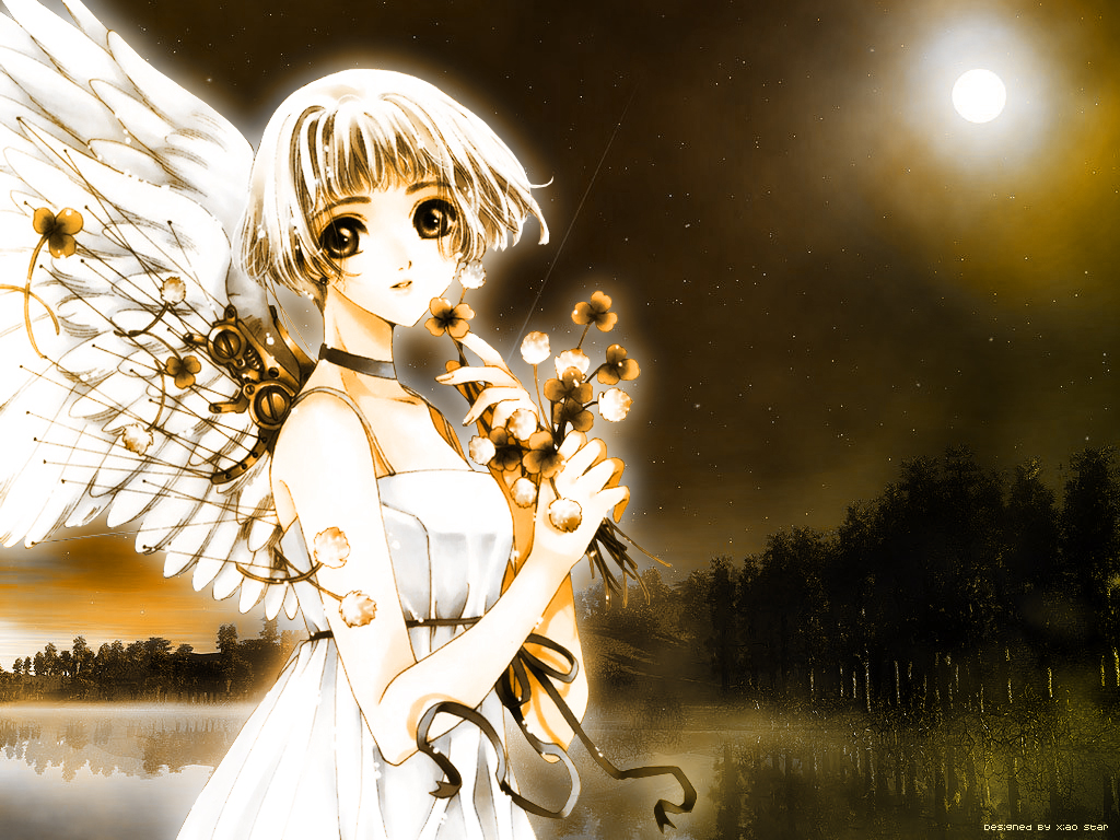 Description: A girl with wings holding flowers in her hand and a moon in the background with trees and water in the foreground.