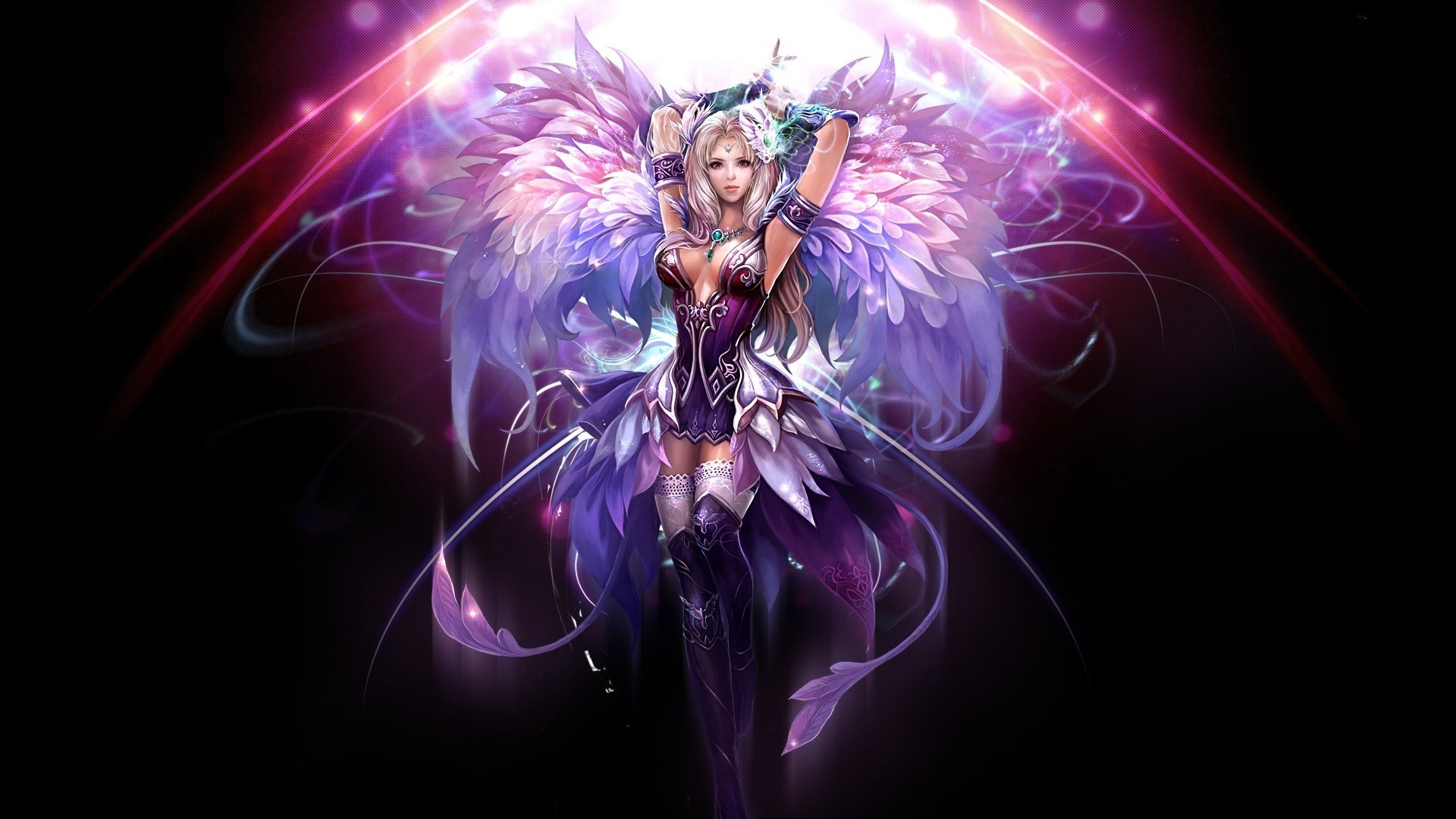 Description: A woman with wings and a purple outfit on holding a sword in her hand and a light shining behind her.