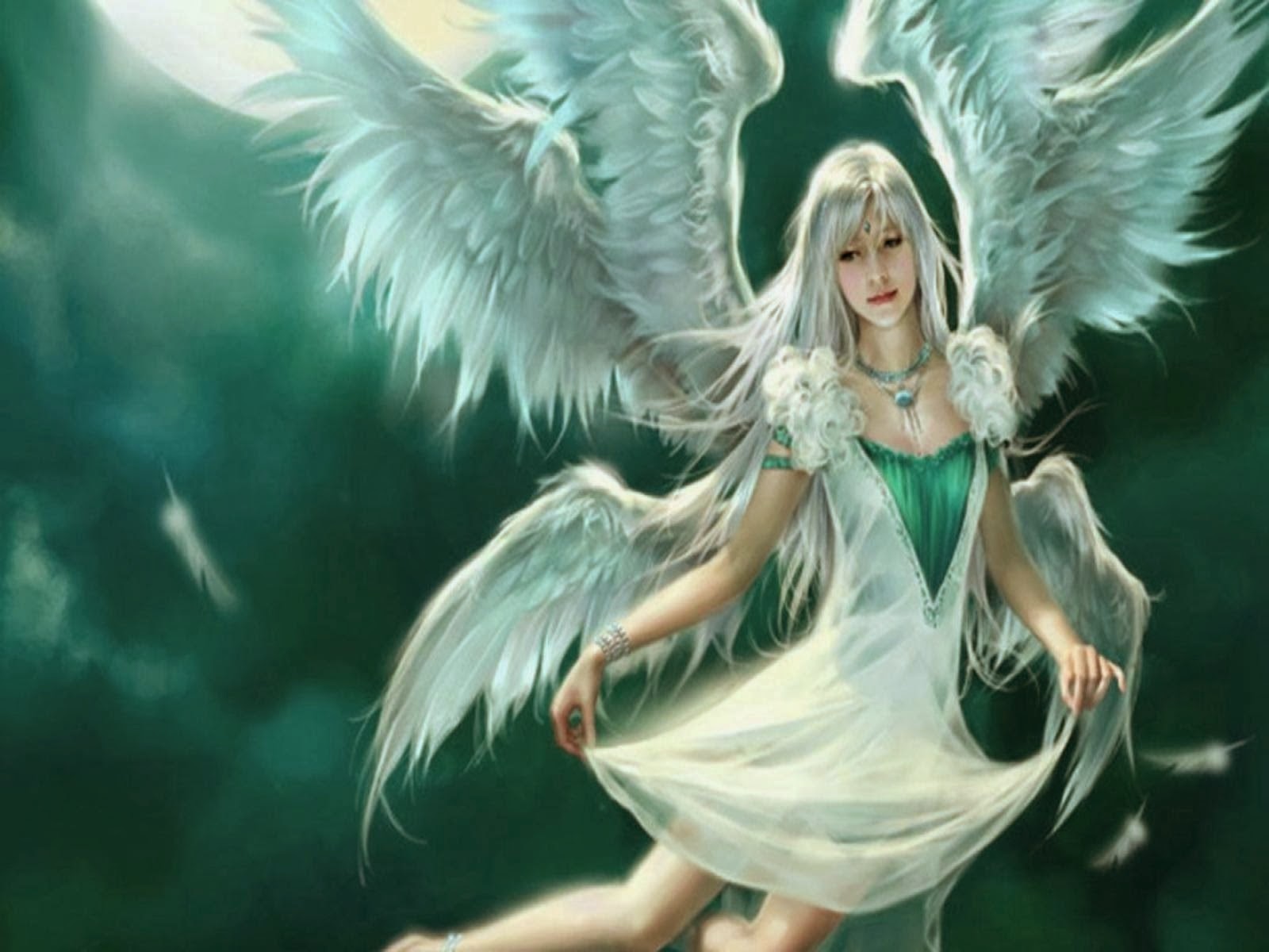Description: A woman with white wings is posing for a picture in the air with her arms outstretched and legs spread wide.