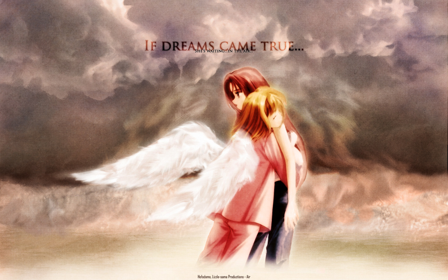 Description: A couple of people that are standing in the sand with wings on their backs and a sky background with clouds.