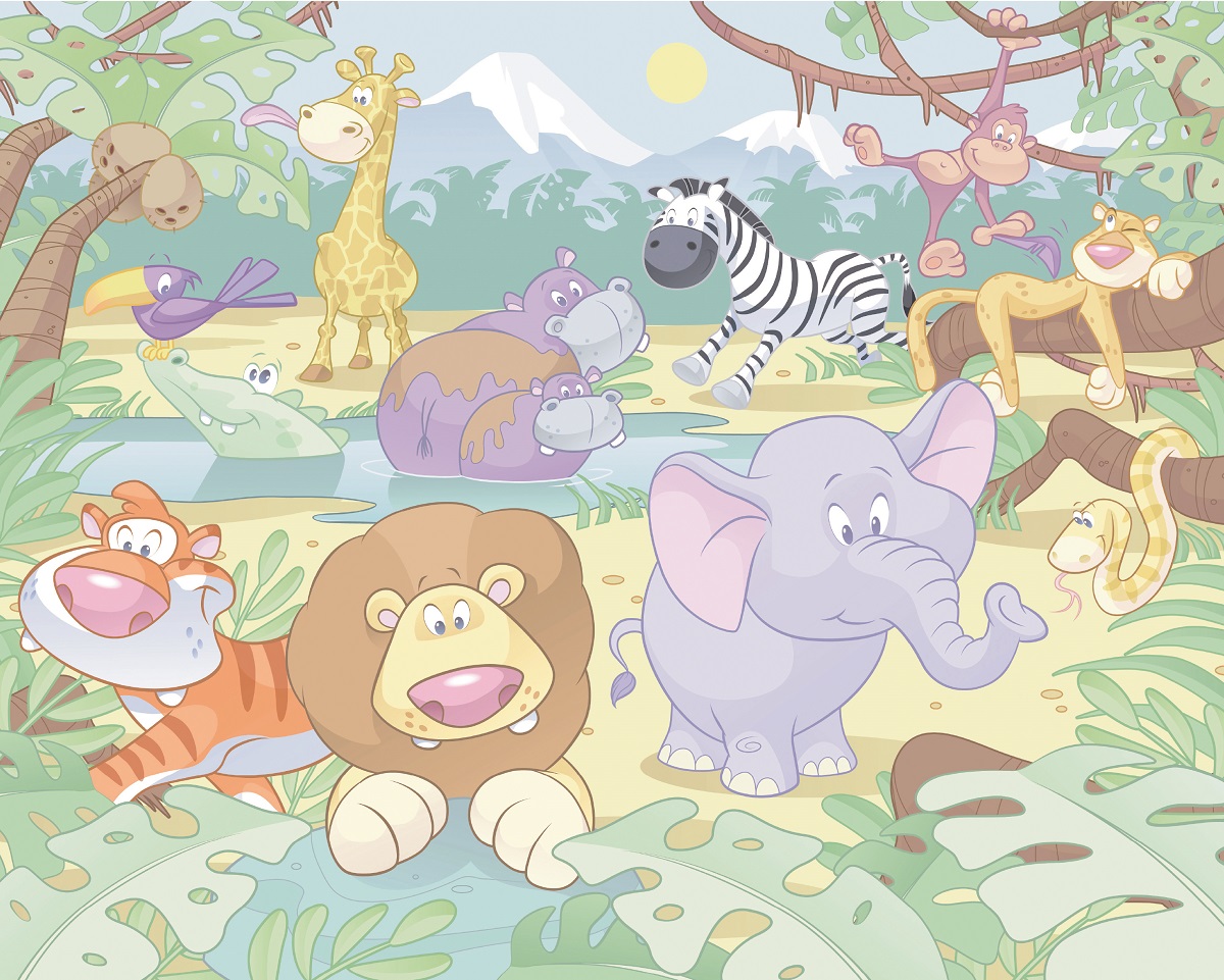 Description: A group of animals that are standing in the grass together in a jungle area with a mountain in the background.