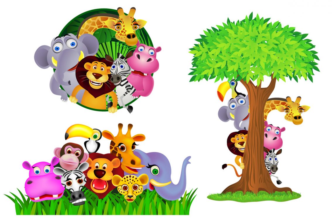 Description: A group of animals that are standing in the grass near a tree and a tree with a giraffe.