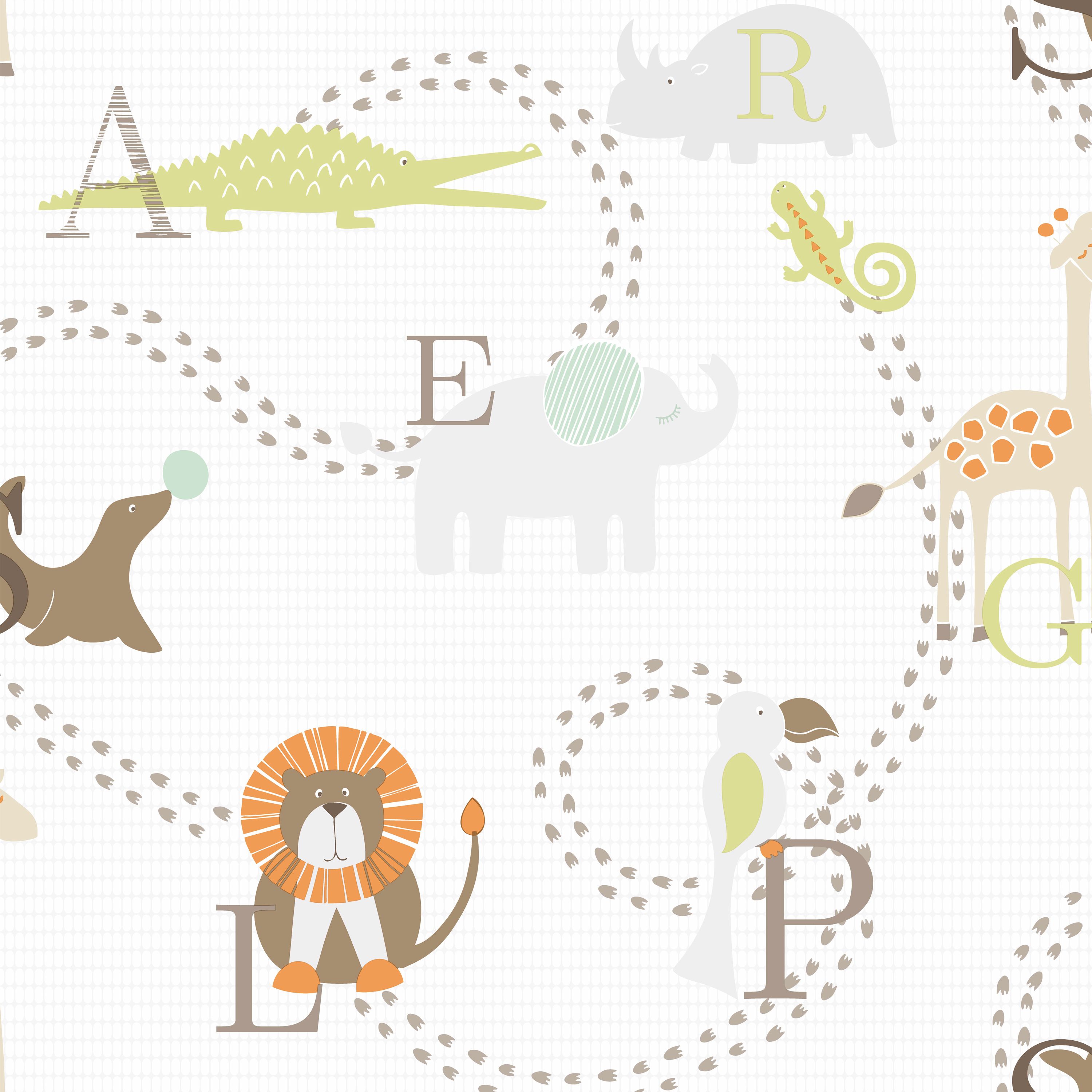 Description: A wallpaper with animals and letters on it in a nursery style pattern.