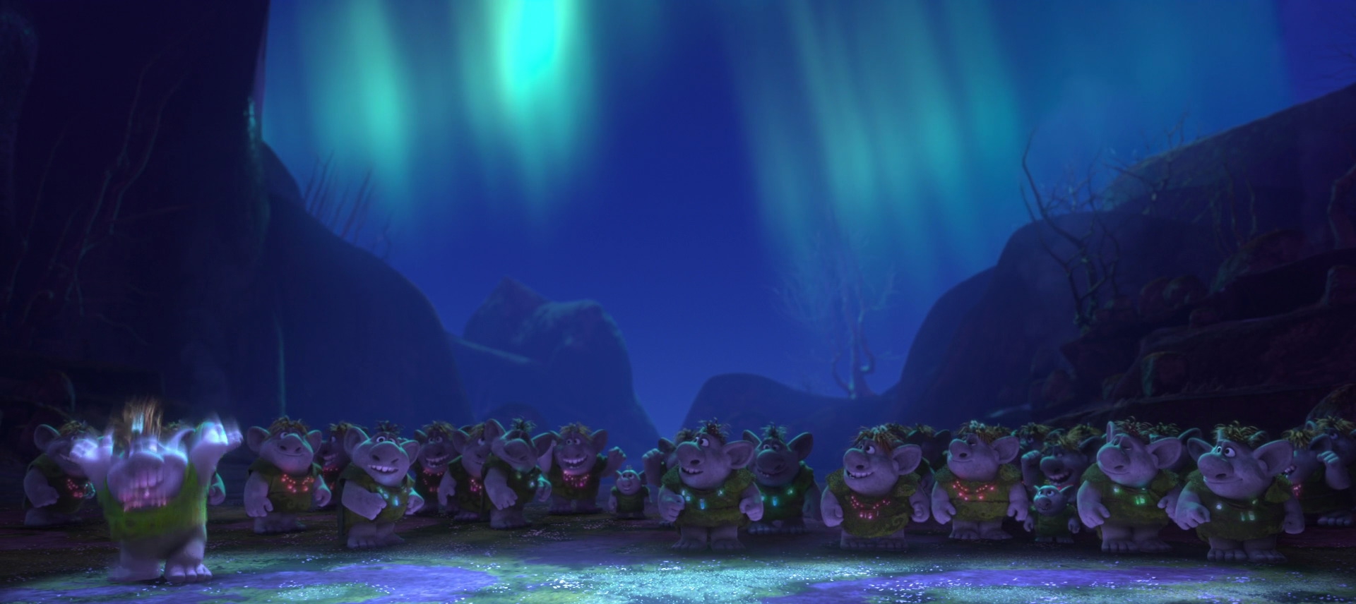 Description: A group of animated animals standing on a stage in front of a crowd of people in a dark room.