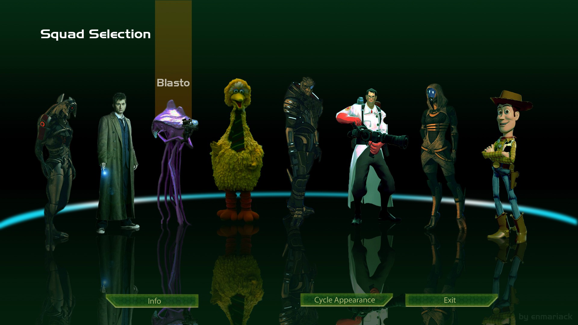 Description: A group of animated characters standing in a circle together in a game screen shot with a black background and a green background.